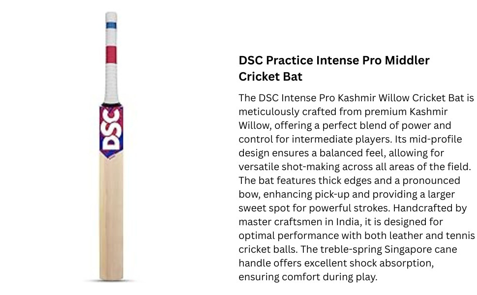 DSC Intense Pro Middler Practice Kashmir Willow Cricket Bat | Color: Beige | Size: Mens | Material: Wood | Premium Leather bat Ready to Play | Massive Edges | For Training and Matches