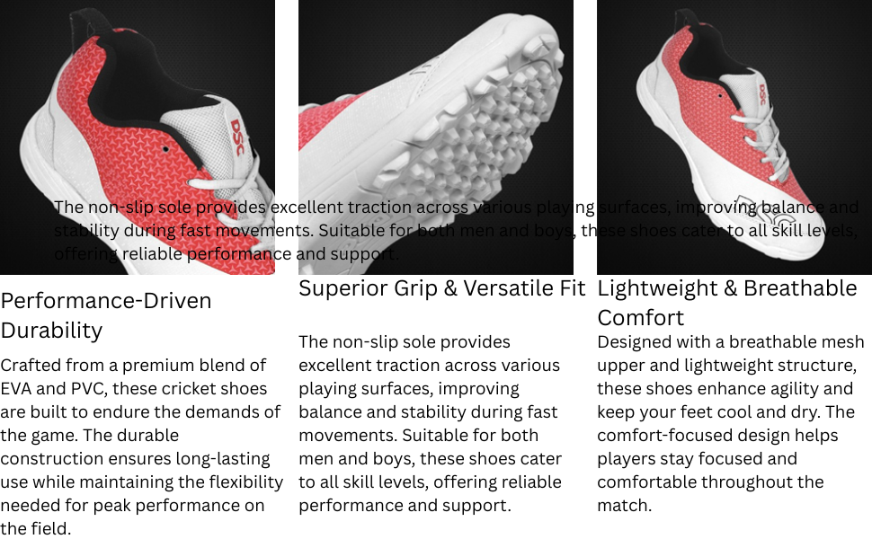 - High-resistant PVC Upper and Outsole: High-resistant PVC upper and outsole combined. Dual-color Outsole: A dual-color outsole features a two-toned design for added style. Ideal for both outdoor and Indoor cricket. Highly durable quality, Toe, and heel protection and has a contemporary design.