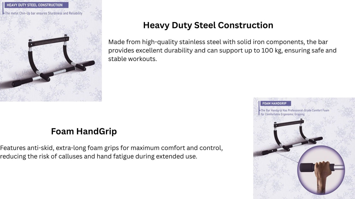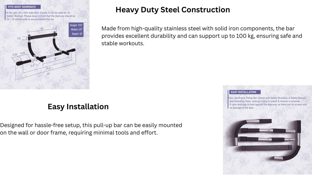 • SAFE AND SECURE - Heavy-Duty Steel coating with solid iron construction Pull-Up Bar and Door Mounts Provide Great Support and Safety - Holds up to (100kg)
