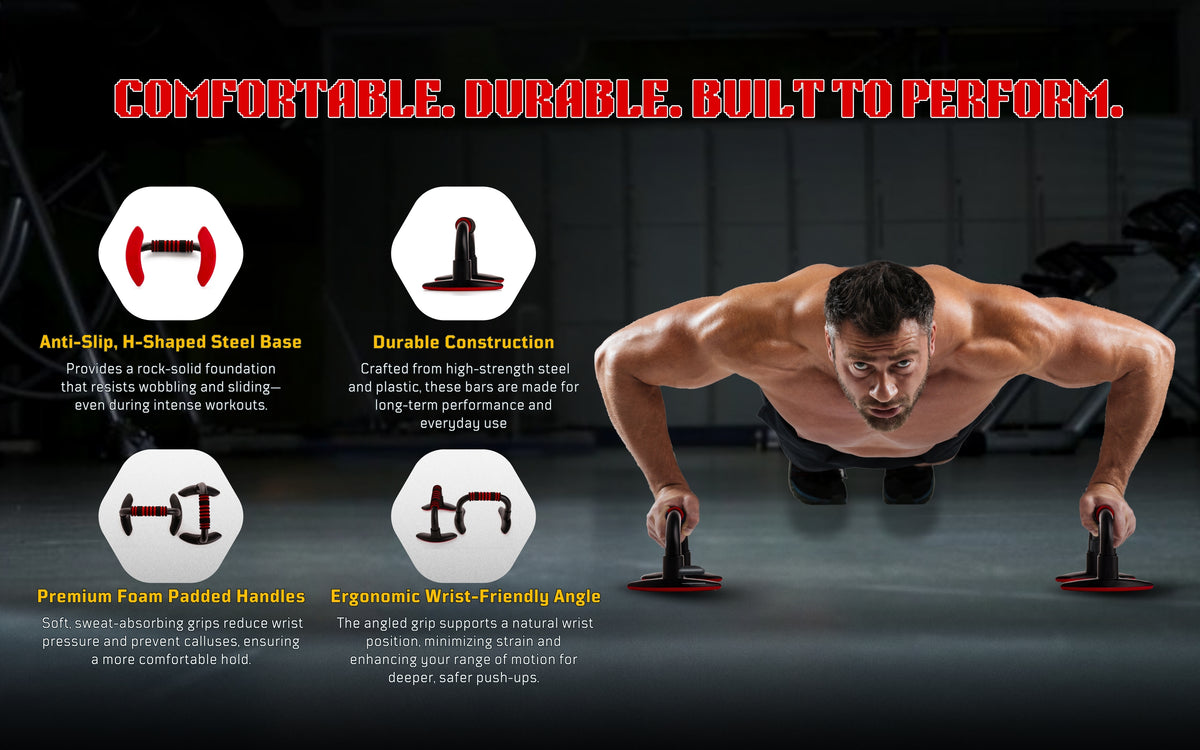 - STABLE, NON-SKID DESIGN: Constructed Steel and reinforced by an H-shaped, foam-layered structure, these push-up bars ensure a stable and secure foundation, preventing wobbling and slippage during intense workout sessions.