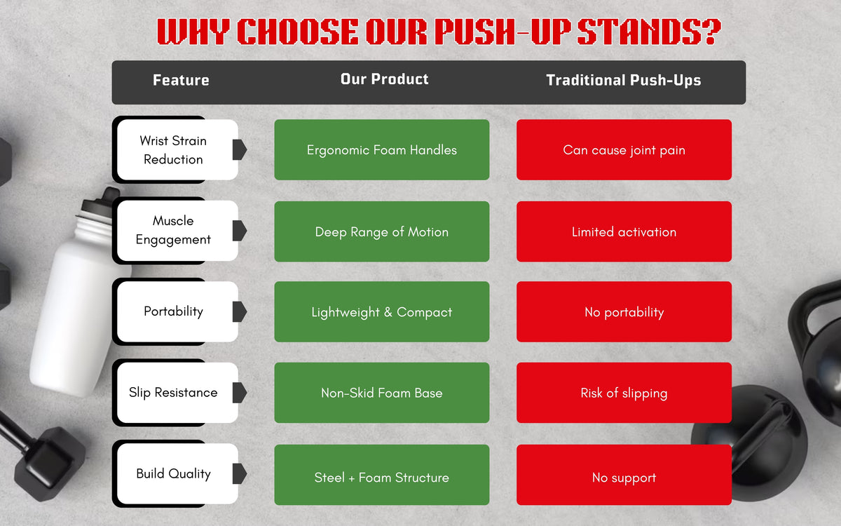 - FLEXIBLE WORKOUT ROUTINE: With these portable push-up bars, exercising becomes convenient at home, in the office, or during travel. Their lightweight and easily disassembled design allow for hassle-free packing into any suitcase or backpack, eliminating the "no time for the gym" excuse from your daily schedule.