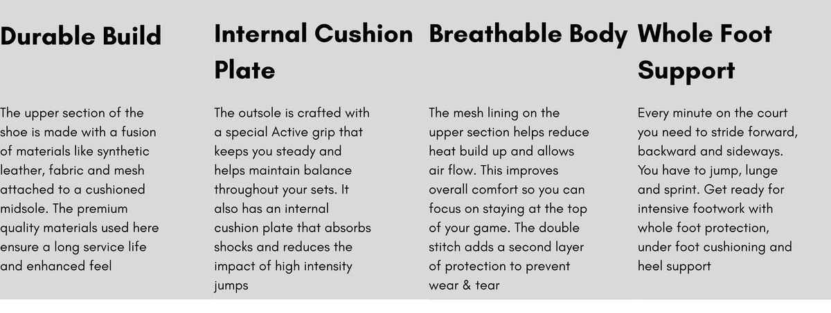 - NON-ROLLING SHOES: Designed for synthetic surfaces, Hundred's badminton shoes feature abrasion-resistant soles with excellent grip and durability. With ultra-light rubber, ergonomic design and active grip technology, these shoes provide support for your heel, enabling exceptional performance on the badminton court.