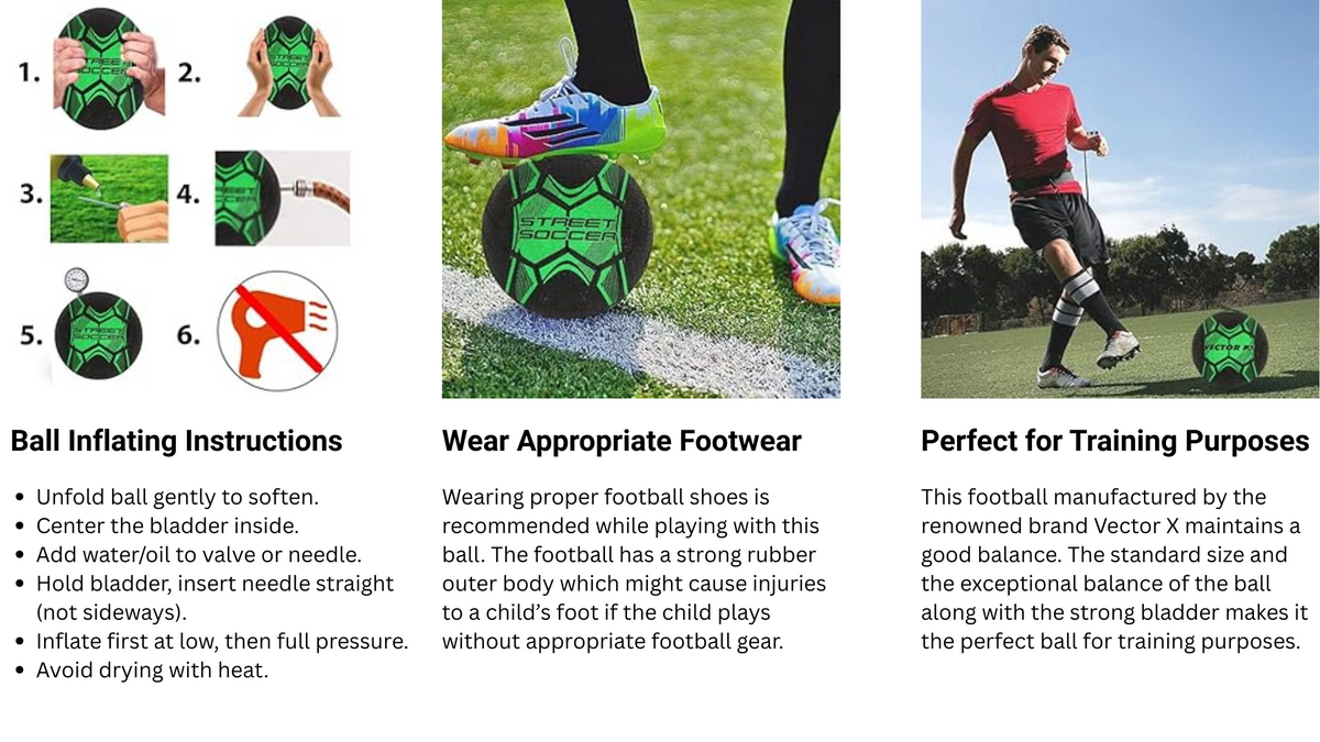 - WEAR APPROPRIATE FOOTWEAR: Wearing proper football shoes is recommended while playing with this ball. The football has a strong rubber outer body which might cause injuries to a child’s foot if the child plays without appropriate football gear.