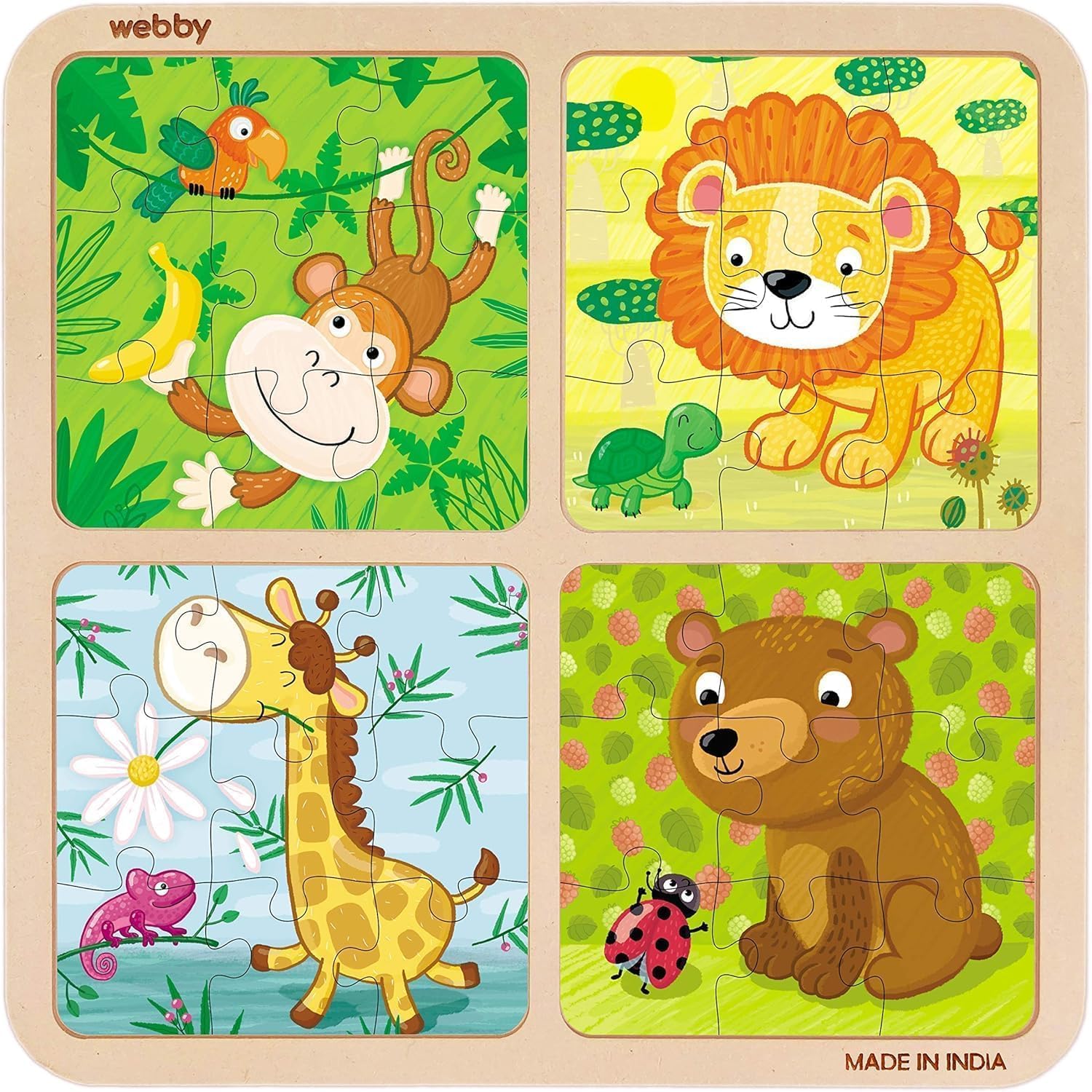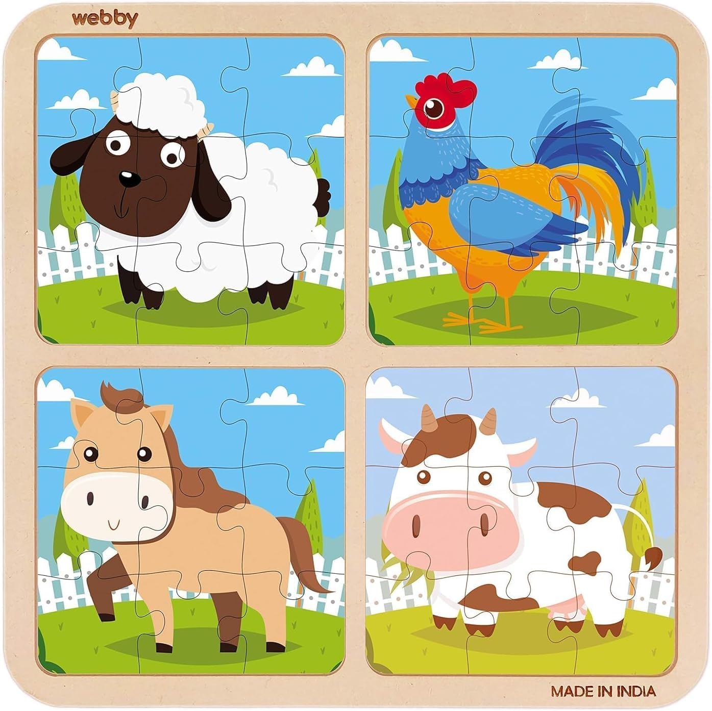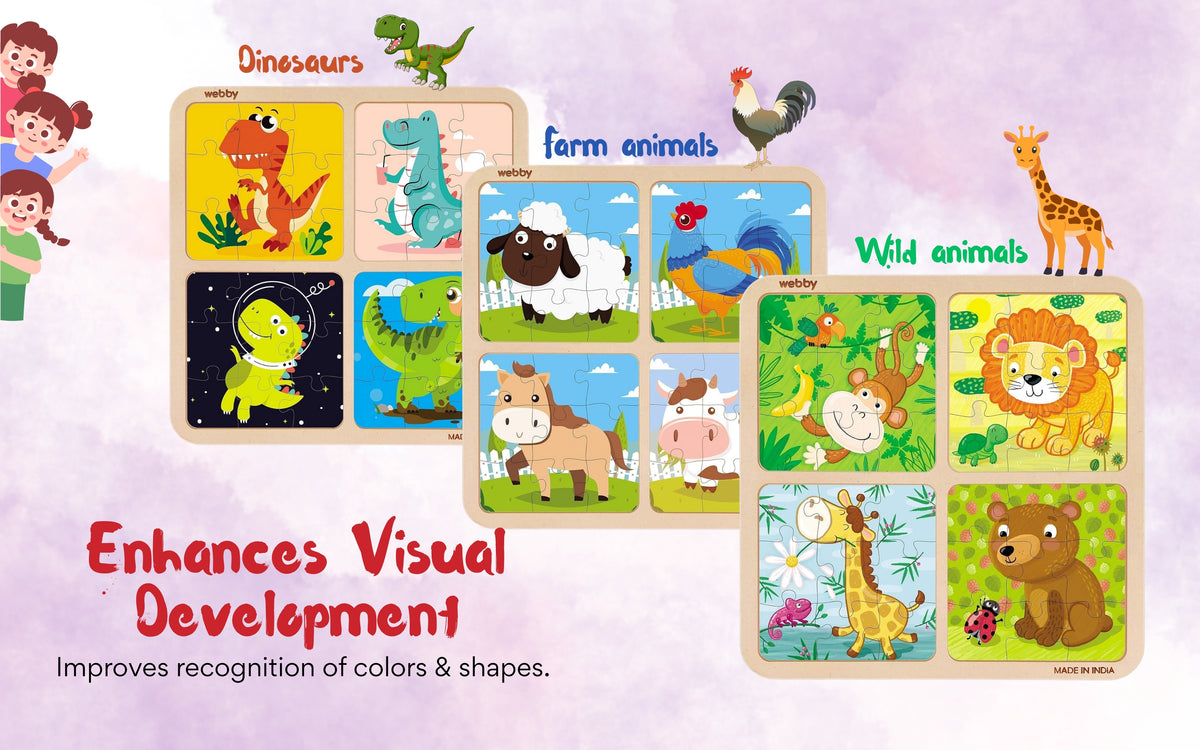 Webby 4-in-1 Educational Wooden Puzzle Set for Kids – 36 Pieces Learning Toy with Wild Animals, Farm Animals & Dinosaurs | Fun Montessori Gift for 3+ Years pack of 3