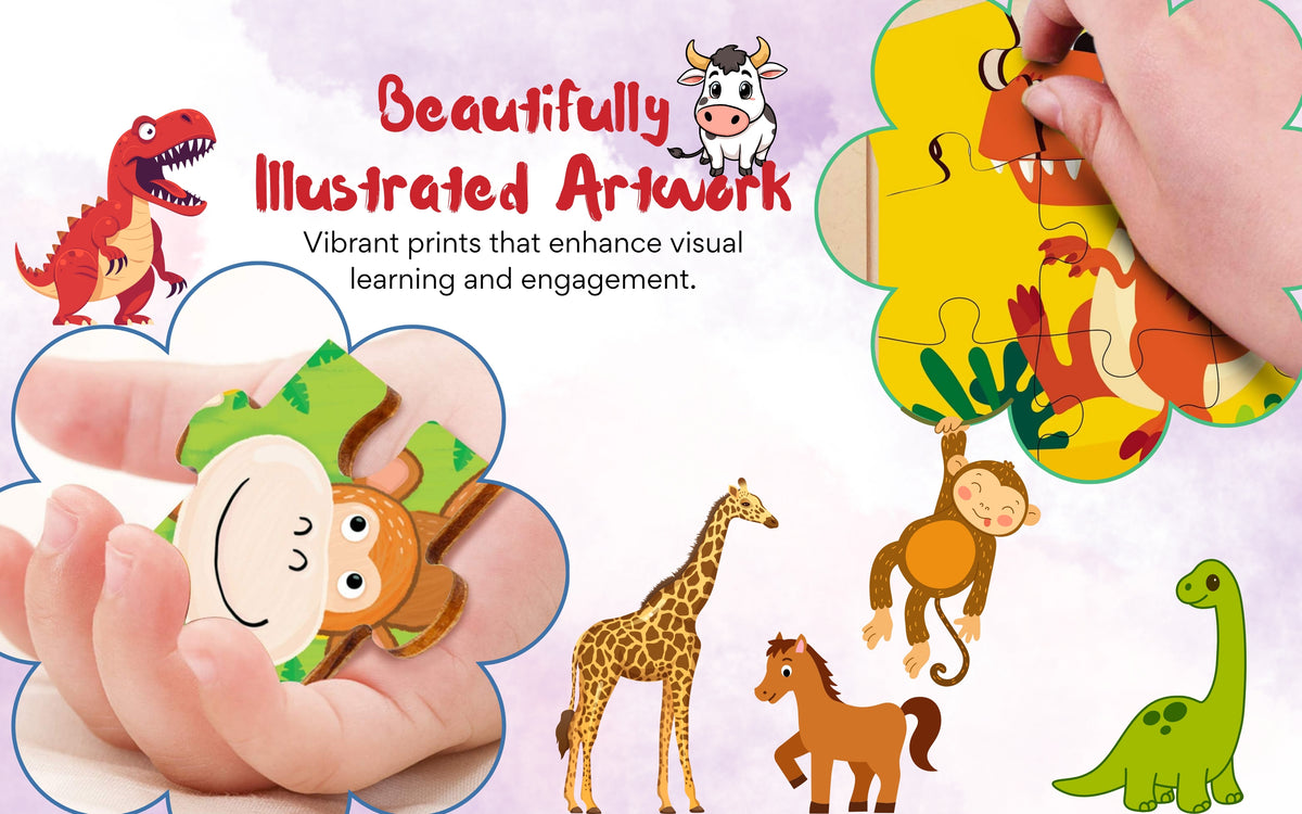 - Contains four themed puzzles (wild animals, farm animals, dinosaurs, etc.) with 36 pieces total.